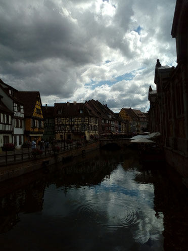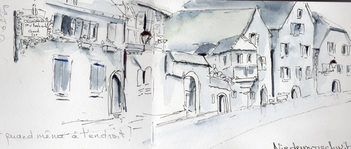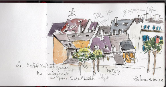 au Café Schongauer , les toits de la ville semblent se découper sur une toile blanche.