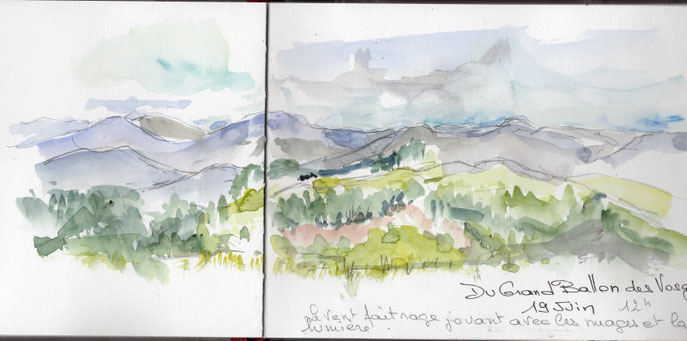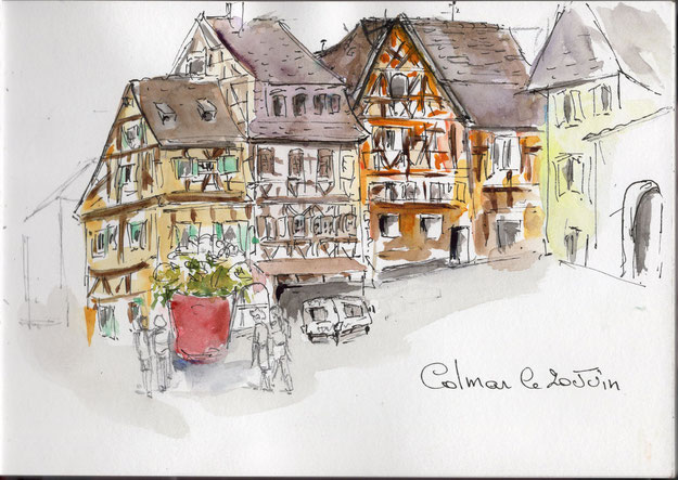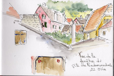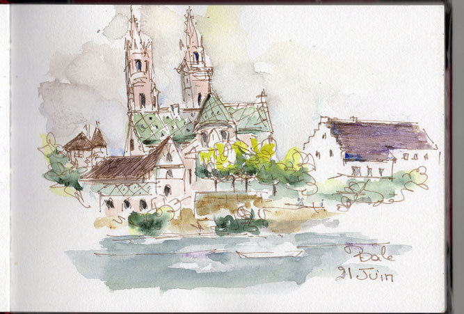 L'averse qui s'abat sur la ville transperce les feuilles d'aquarelle. Tant pis l'emblème de la ville restera un peu blême et le carnet se finira brutalement.